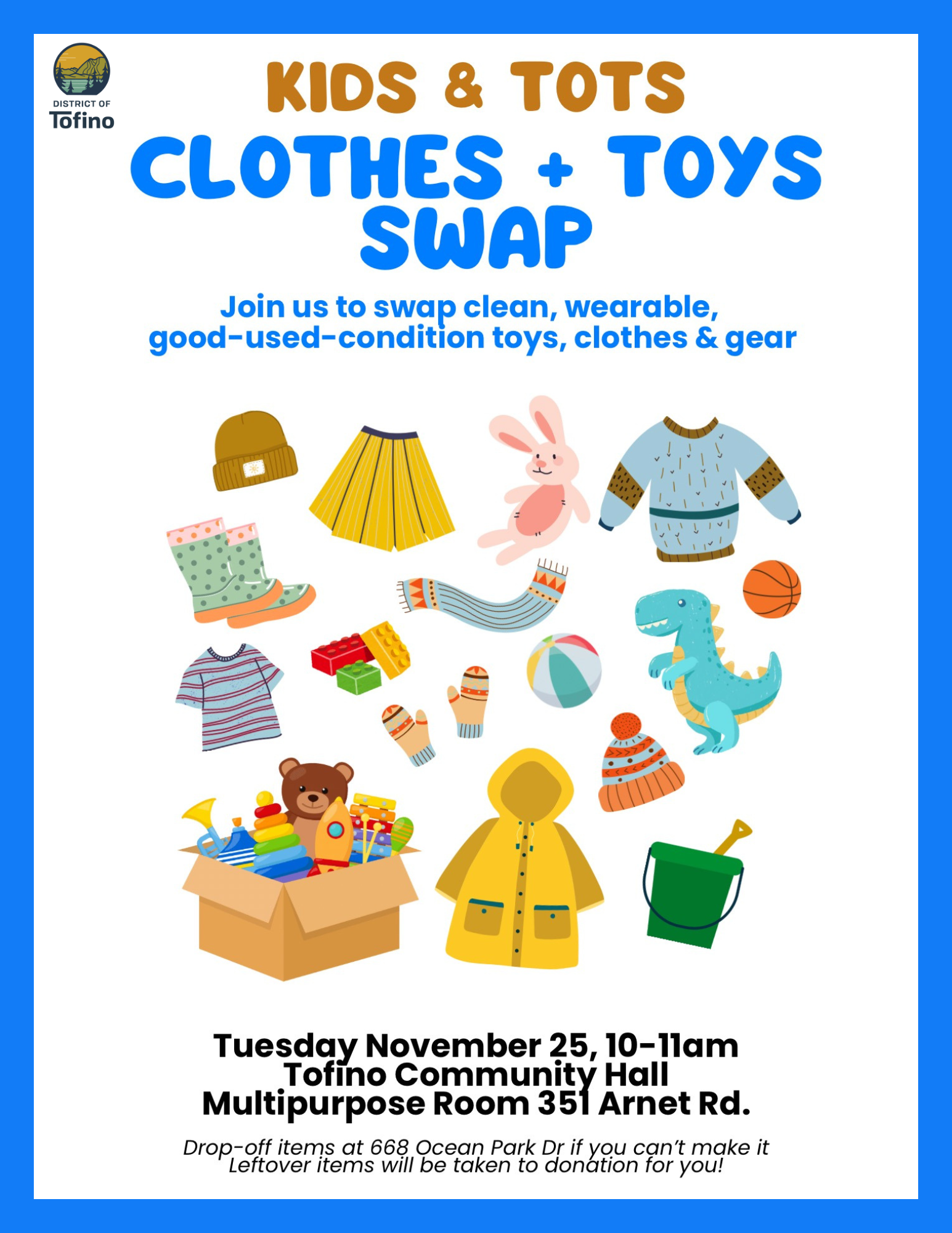Kids & Tots Clothes and Toys Swap + Add to Google Calendar + iCal / Outlook export 00 days 00 hours 00 minutes 00 seconds Date Nov 25 2025 Time 10:00 am - 11:00 am Location Tofino Community Hall Category Recreation Share this event